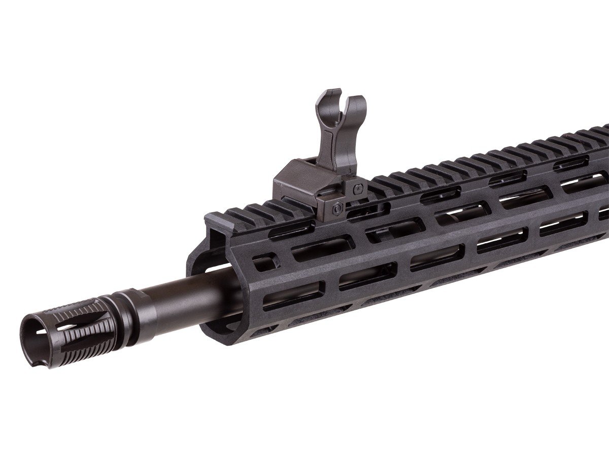 You’ll get accurate shots because of the flip up iron sights in the front and rear that are removable and adjustable, plus the full length Picatinny scope rail so you can add a dot sight or scope. You also get M-LOK accessory slots on both sides and the bottom of the handguard so you can attach accessories like lasers and lights.